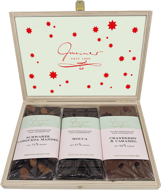 Schatzkiste mit 3 Tafeln handgeschöpfter Schokolade Ihrer Wahl.